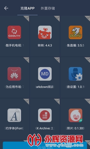 2、通过外置存储直接安装APK文件;点主界面底部按钮——添加应用,然后选择后面两个TAB即可。