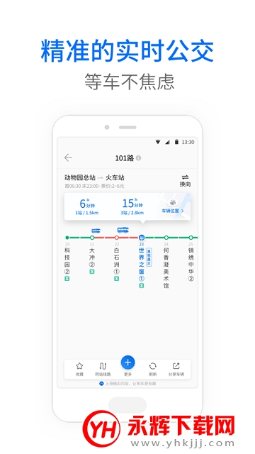 输入公交线路OR公交站点名称,准确告知您欲乘坐的任一公交车当前位置、发车时间以及到站信息。