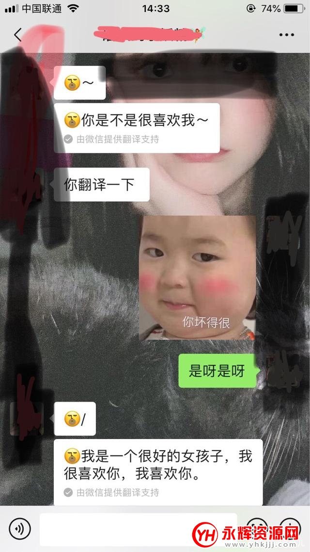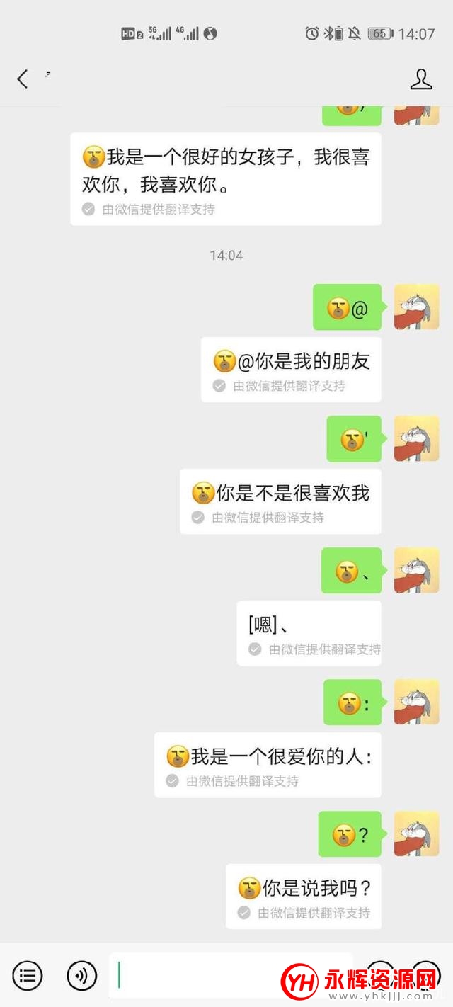 [Emm]加斜杠,微信翻译君就暴露了自己是个女孩子的事实「我是一个很好的女孩子,我很喜欢你,很喜欢你」。