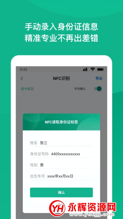 可以轻松识别有关信息,NFC身份扫描app可快速读取证件信息,劳务派遣,导游,会计等场景适应。