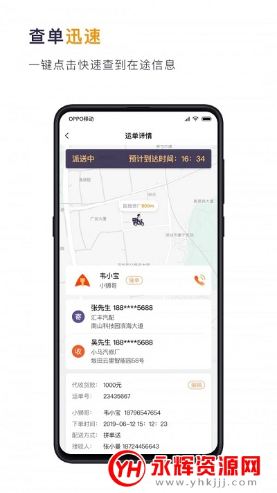 1.系统派单后在应用内查看新运单,包括取货地址,送货地址,电话等信息