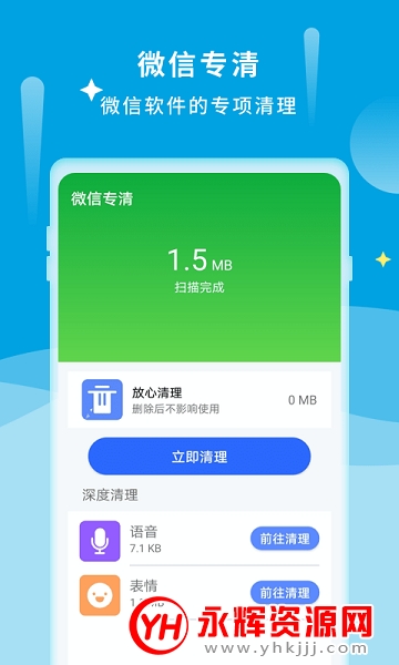 非常专业的手机清理软件,可以一键快速清除你手机里面的无用文件,不占用手机内存;