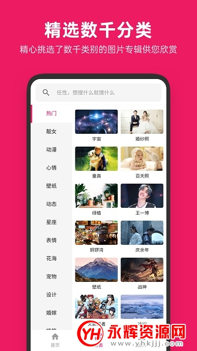 3、精心挑选了壁纸、表情、心情、搞笑、美食、汽车、宠物、明星、儿童、星座、动漫、游戏、旅游、中国风光、海外风光、家居、世界、军事、设计、婚嫁、动态图等二十余大类上千子类的专辑图片