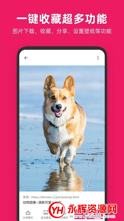 4、提供图片分享,保存,下载,设置壁纸,以及来源网页链接,不良图片举报等功能