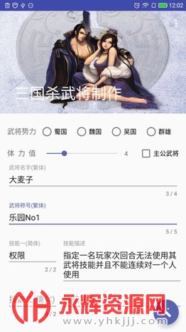 Diy三国杀武将制作器手机版最新版是一款特别有意思的游戏工具,软件主要是针对三国杀游戏的玩家打造,通过这款工具玩家可以亲自尝试制作各种武将,自己定义制作武将的技能,形态等等,操作简单,感兴趣的朋友就快来永辉下载体验吧!