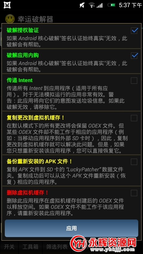 – 支持筛选应用程序列表:按授权验证、Google广告、自定义破解、虚拟机缓存修复、未发现破解