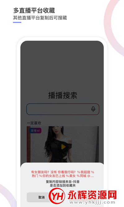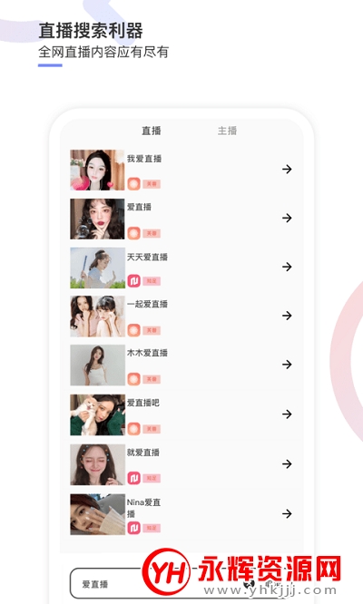 播播搜app是一款为喜欢看直播的朋友们打造的直播搜索辅助软件。这款软件内包含的直播平台非常广泛,你喜欢看的主播都是可以直接搜索进入直播间的。对这款软件感兴趣的朋友们还在等什么呢?快来永辉资源网下载吧!