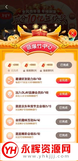 2021年的 京东开启了 新一轮的活动“全民炸年兽 年味到家——瓜分10亿年终奖”。它的玩法与双十一和双十二的活动有着异曲同工之处,同样是浏览商品获得所需升级物品,然后点亮升级。不同的是,此次完成活动任务获得的是爆竹,用爆竹来炸年兽,从而分得红包。
