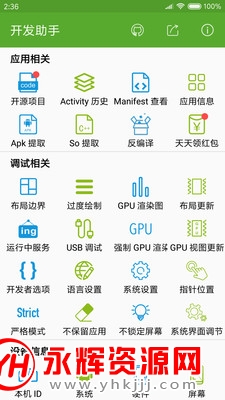 ·快速打开或关闭开发者选项中的选项。将原来几十秒的操作缩短为一次点击。包括显示布局边界、显示 GPU 过度绘制、显示布局更新、强制 GPU 渲染、显示 GPU 视图更新、显示指针位置、严格模式、不保留活动、不锁定屏幕。