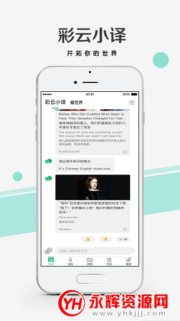 彩云小译无限彩云朵版是一款非常好用的手机翻译辅助工具软件,软件通过强大的互联网技术为用户精心打造了一个功能全面的翻译辅助平台,在这里用户可以非常方便的进行中外文的翻译,多种翻译模式可以选择,非常的方便实用,有需要的朋友就快来永辉下载体验吧!