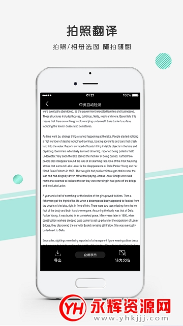 点击首页右下角的"文档"按钮,上传手机中的PDF或docx文档,选定语种,即可获得双语对照的翻译结果!使用同一账号登录,在电脑和手机上均可浏览和下载