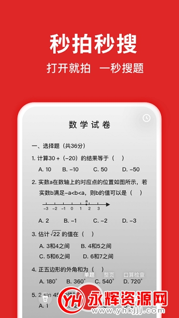 【拍照搜题】轻轻一拍,解答立刻呈现,更有知识点解析、帮你迅速理清思路,轻松学会