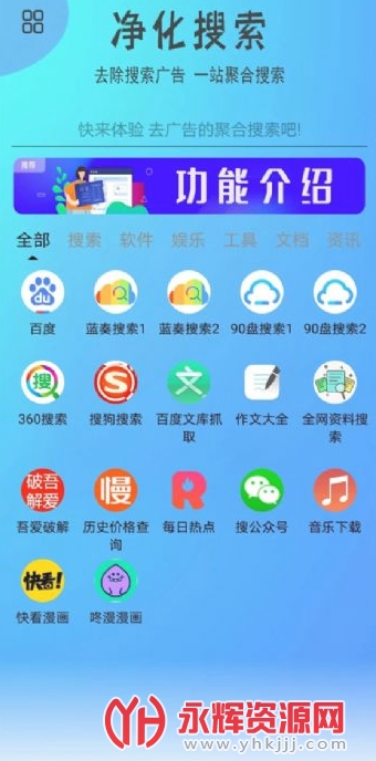 净化搜索,是一个纯净资源搜索器,并且净化全部搜索广告。里面有17个搜索引擎,不仅包含我们最爱的蓝奏资源,还有吾爱、百度文库、全网资料等引擎。致力为用户提供更加纯净和高效的一站式搜索服务,告别搜索广告和弹窗的困扰。