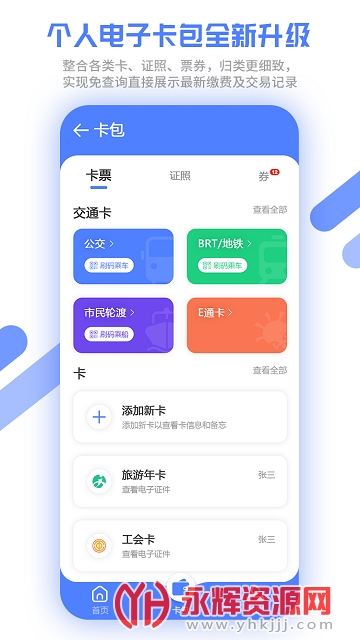 整合各类卡、证照、票券,归类更细致,实现免查询直接展示缴费及交易记录