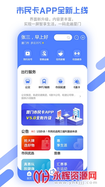 厦门市民卡免费版是一款非常好用的本地民生生活服务手机软件,软件专门为厦门本地的朋友构建了一个功能多样的生活服务平台,在这里用户能够利用软件来出行搭乘各种公共交通工具,并且还能随时随地查看最新政策信息,非常的方便,有需要的朋友就快来永辉下载体验吧!