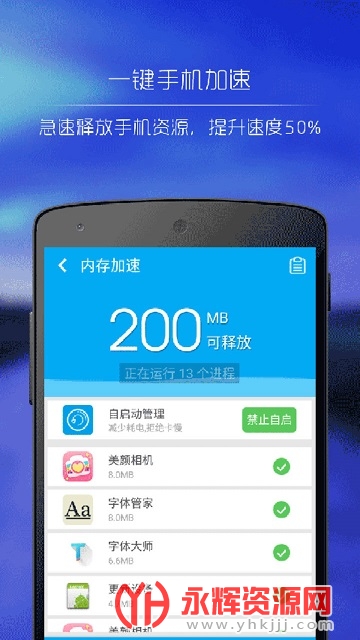手机加速,都是一键式的操作,可以直接清理手机缓存垃圾,加快运行速度;