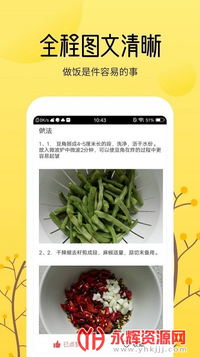 烹饪美食大全app是一款非常优质的美食制作教学软件。这款软件中有着超多全国各地的特色菜、家常菜的教学方式,能让你在手机上学会制作美味佳肴。快来永辉资源网下载吧!
