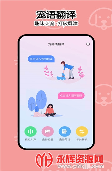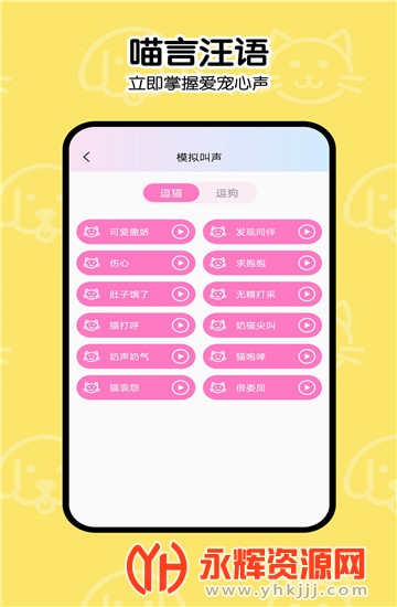 一起学猫叫是一款宠物语言交流应用,可以对宠物猫、狗的语言进行翻译,模拟宠物叫声,还可以保存宠物相片到宠物相册,编写宠物笔记。