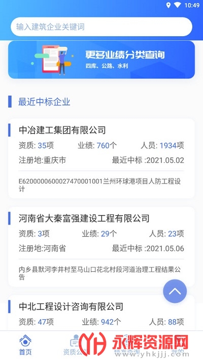建筑行业查询平台app是一款十分优质的建筑相关查询软件。这款软件的功能十分强大,能给你提供在线搜索建筑业注册信息、招投标信息动态等内容,有需要的朋友们可以来永辉资源网下载使用!