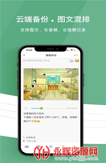 记录 :文字、音频、图片、视频多种记录方式,满足各种情景下的记录日记需求。