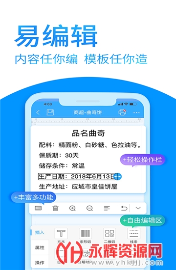 支持文字、图片、图形、一维码、二维码编辑,随意排版,方便实用,