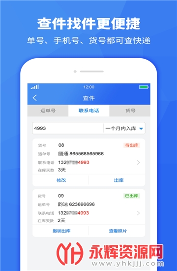 5.查件服务:可根据手机号、运单号和货号进行查询,支持扫码和手动输入方式,准确查询和查询后的更改和出库操作。