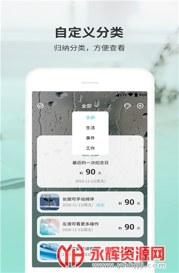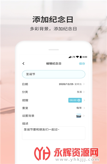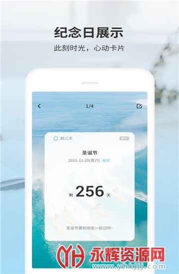 1、纪念日提醒功能,能够设定时间,进行事件提醒。