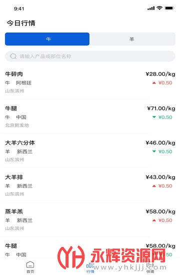 3、切换到行情页面查看牛肉行情,点击搜索功能查找产品查看该产品价格变动情况