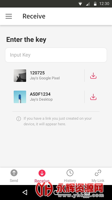 在接收设备上输入该密钥并立刻下载文件
