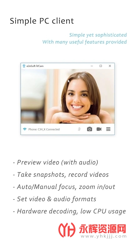 ivcam手机摄像头官方最新版能把您的手机或平板电脑变成一个给Windows电脑用的高清网络摄像头,兼容几乎所有使用摄像头的软件。您也可以用它来替换旧的 USB摄像头或集成摄像头,因为手机的视频质量更好。