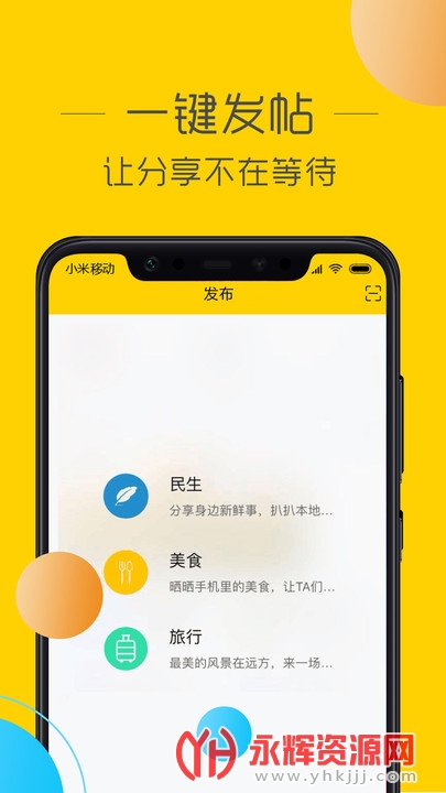 1、提供了发布功能,分类选择发布的内容,一键就可以上传图片、视频进行发布;