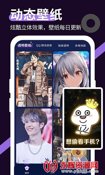 1、海量资源,精心挑选娱乐明星、卡通动漫、影视大全、动物萌宠、热门游戏等多种静态动态壁纸资源;