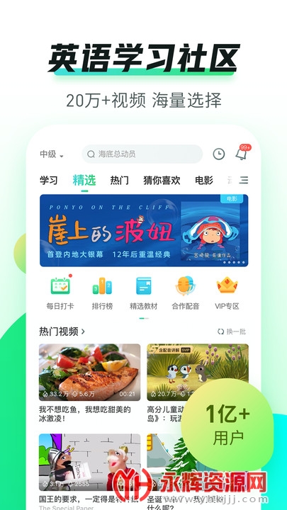准备不同学习阶段的英语短视频素材,20w+素材涵盖美剧、电影、动漫和歌曲;