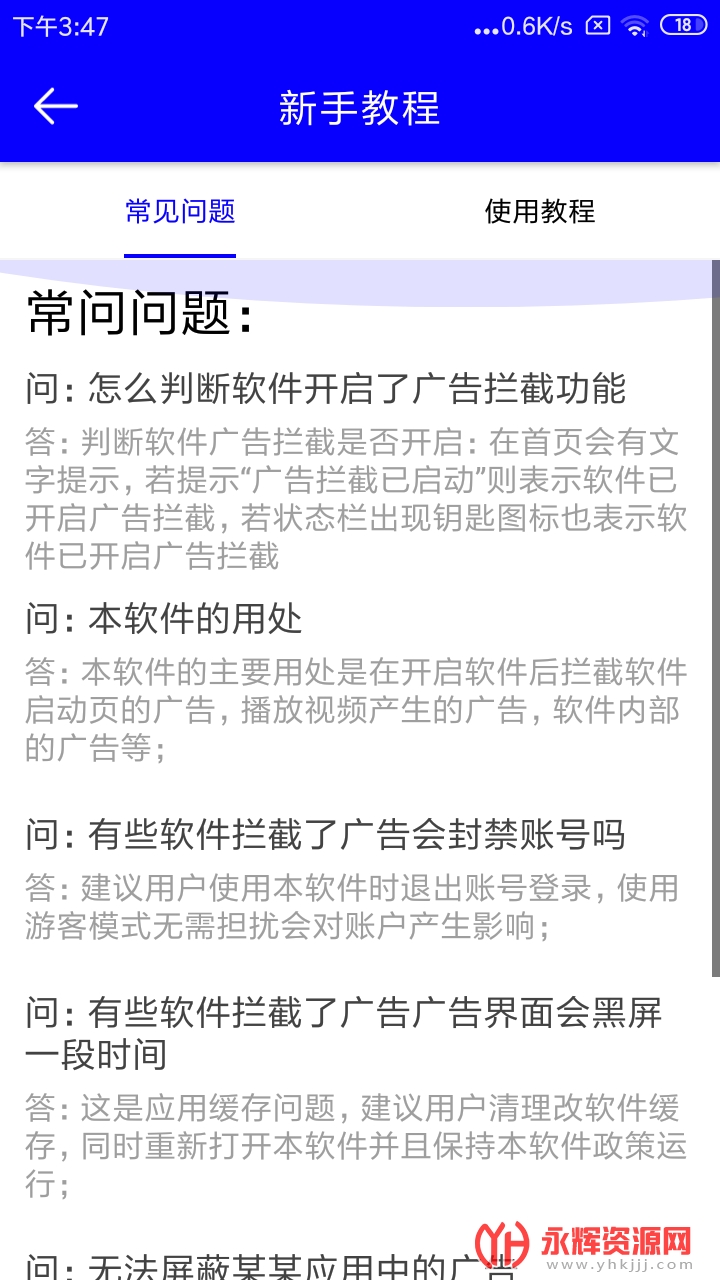 答:本软件的主要用处是在开启软件后拦截软件启动页的广告,播放视频产生的广告,软件内部的广告等;