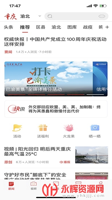 整合华龙网、重庆日报等本土资讯,集合热点推荐、国际、社会、等海量新闻热点和优质视频内容,每日更新海量新闻信息。