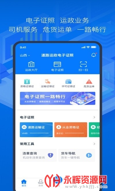 道路运政电子证照APP软件与山西等省市道路运输电子证照系统和运政管理系统进行数据对接和业务协同,向道路运输经营业户和从业人员提供道路运输经营许可证、道路运输证和从业资格证三类电子证件的在线申领、亮证、授权及线上运政业务办理服务,为行业管理部门提升数字化便民服务水平及监管能力,打造数字化运政服务体系提供支撑。道路运输从业人员和经营业户可通过“山西道路运输电子证照APP”实现电子证照的申领、亮证、扫码认证、证照授权等基本功能。同时,还可查询车辆违章、使用货车导航等服务功能。