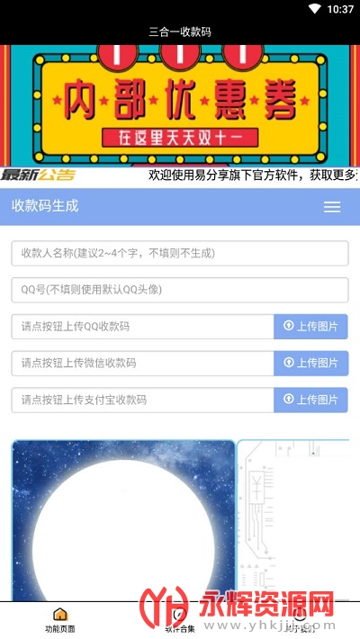三合一收款码制作app是一款可以一键帮你制作收款码的应用软件,使用这款软件可以一键帮你制作微信、QQ、支付宝的三合一收款码,有需要的朋友们快来永辉资源网下载使用吧!