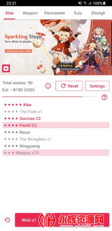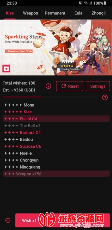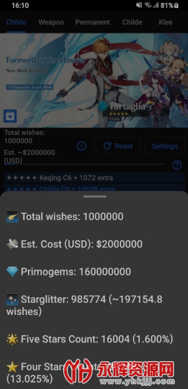 轻巧,简洁.大约20 MB下载!to适用于游戏中的gacha速率,包括可怜和可怜的怜悯.跨越1,000,000个愿望的仿真:五星级为1.602%,四星级为13.013%.