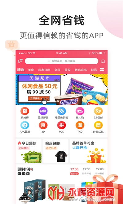 全网省钱app是可以帮你省下好多钱的购物平台,软件中有着很多商品的隐藏优惠券,用户在领券后下单都是能享受最高折扣的,还在等什么呢?快来永辉资源网下载吧!