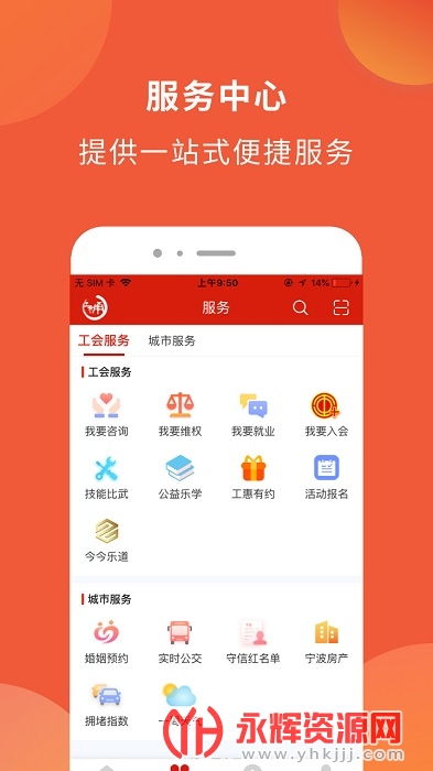 工会信息、就业服务、技能培训,法律咨询、困难帮扶、职工书屋等服务模块。