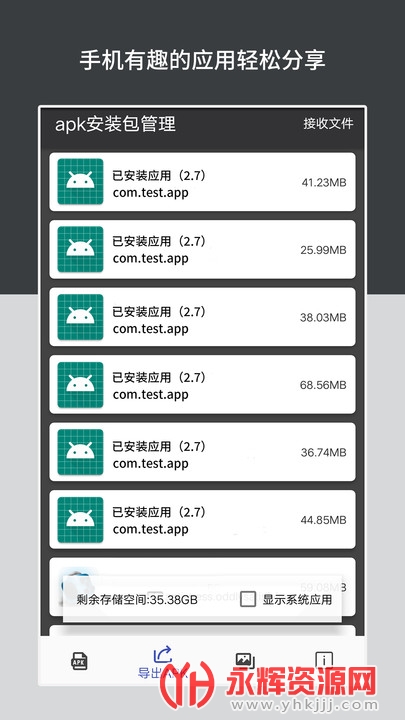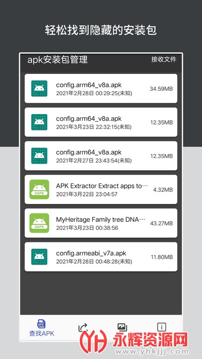apk安装包导出app是一款功能强大的手机文件管理小工具,用户可以用这款app来查找手机中遗忘的安装包,及时的清理掉没用的安装包,清理手机内存。同时还可以分享手机中的应用,非常的方便快捷,是一款很好用的手机文件管理app。欢迎感兴趣的朋友前来永辉资源网下载!