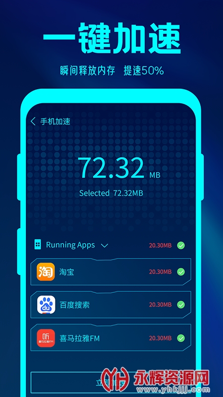 用户在使用软件时可以通过软件的授权,在软件运行时可以轻松将用户的后台无用的运行程序,提高用户的手机速度,轻松使用,一键就可以加速,非常方便;