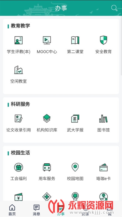 APP中集合“教育教学、科研服务、校园生活、管理服务、学生工作、公共服务”六大板块,包含珞珈e卡、小爱同学、课表查询、MOOC中心、 邮箱、0A、校园卡、统一支付平台等40多个应用,同时还汇集了图书、期刊、论文、专利及教学视频等优质学习资源。