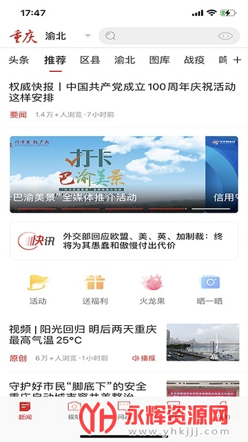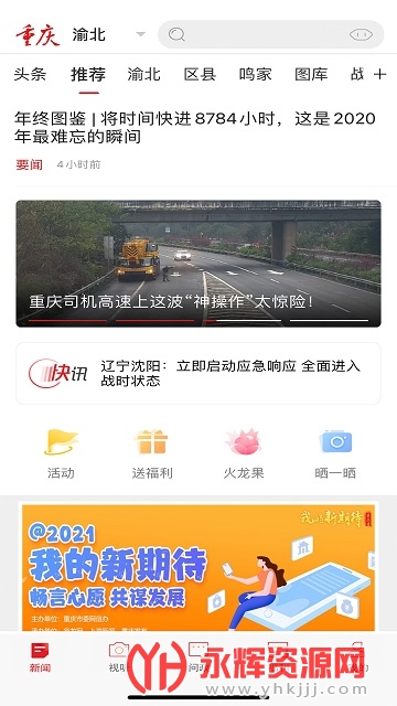 新重庆客户端是一款专门为重庆本地的朋友精心打造的掌上资讯生活服务手机软件,软件能够为用户带来本地最新发生的各版块新闻,还有国内外各领域的大事,实时掌握城市变化动向,更了解重庆这座城市,非常的方便实用,有需要的朋友就快来永辉下载体验吧!