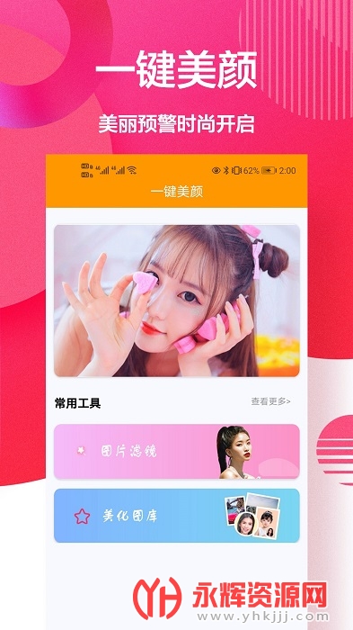 妆容:一键美颜,仙女就是你。智能五官,精准定位,瘦脸,粉底,唇彩,腮红,修眉,染发,肤色自然靓丽,分分钟变俏美!