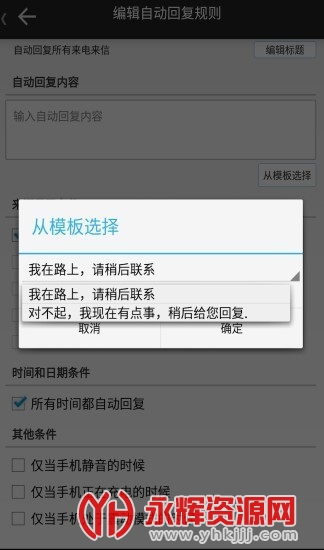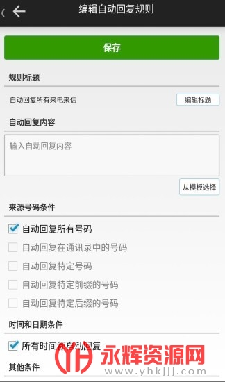 自动回复可以设置多个条件,包括时间、日期、星期、号码来源等范围;
