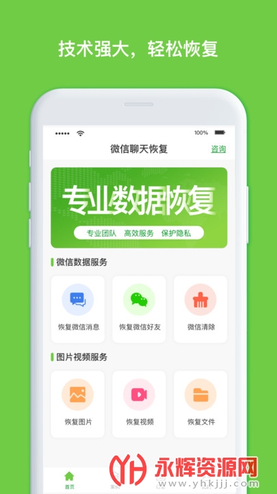 聊天记录恢复是一款非常实用的手机数据恢复工具,它的功能十分强大,可以帮助用户找回不小心删除的聊天记录、图片和视频等等。同时操作起来也是非常的简单,只需用手机一键操作就能够快速的找回删除的内容,可以很好的帮助用户解决误删重要聊天记录的问题了。有需要的伙伴们就来永辉资源网下载吧!