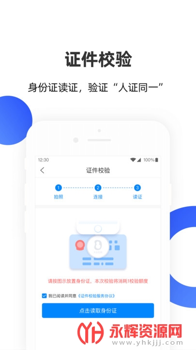 搭配认证徽章使用,支持读取校验二代身份证件信息资料有效性,一键比对身份信息与人像照片匹配校验。