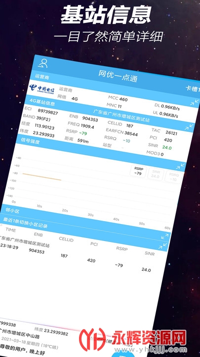 一款手机信号强度检测器,是网优行业的必备工具,可以显示手机的运营商、网络类型、LAC(位置区码)、CID(小区ID)、信号强度、相邻小区信息等基站信号相关信息。
