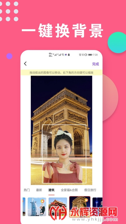替换背景:内置上百套优质背景图库及贴图,任意更换想要的背景或选取相册自定义添加。